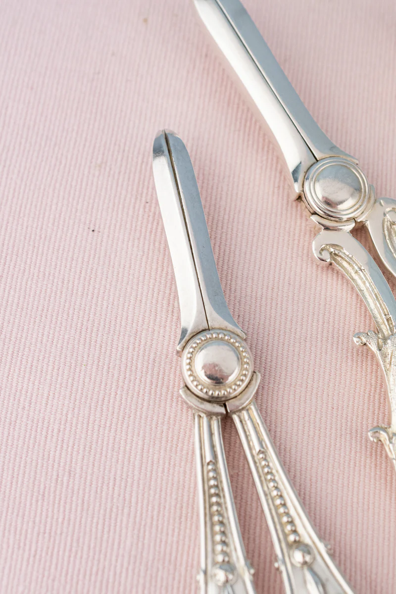 Behold, the elegant Victorian Silverplate Grape Shears! Specifically designed for elegantly cutting grape stalks at the table, the handles are longer than the blades, so that one could insert the blades deeply into a cluster of grapes. The tips of the shears were purposefully blunt, so that they won't puncture the fruit. The patterns of grape shears varied widely, from detailed grapevine motifs to classic designs that would complement the rest of a cutlery set.