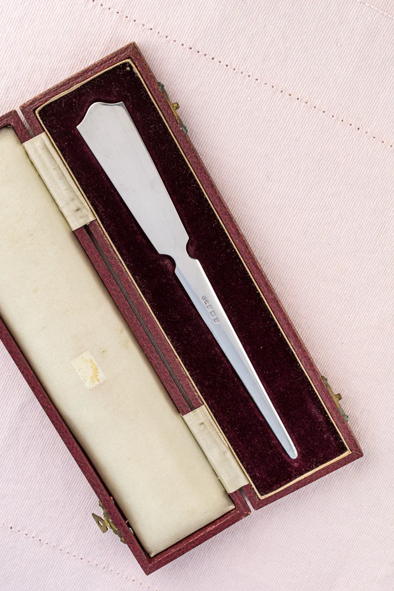 A most elegant way to open the day's mail, this Vintage English Sterling Silver Letter Opener was spied in the north of England still nestled within its original presentation box. With a pleasing weight and striking silhouette, it promises to make a glamorous addition to any surface, whether antique desk, family command center or that tiny table alongside your favorite reading chair.