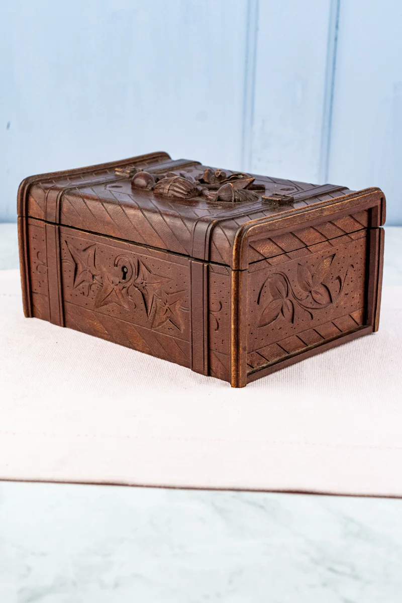 Found at a market in Paris, we are pleased to offer this delightful antique French Carved Wooden Box. Featuring intricate, expertly hand-carved designs, the box artfully showcases the renowned wood carving skills from the Forêt Noire or Black Forest region of France and Germany.