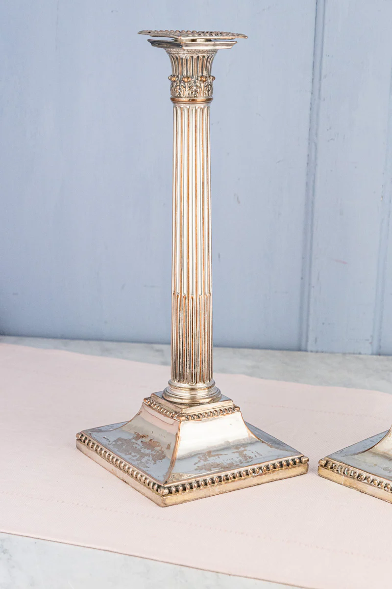 This pair of candlesticks carries all the lovely hallmarks that make Old Sheffield Plate so prized by collectors. In a classic neoclassical columns with square plinth pedestal base, these slender candle holders are adorned with a romantic garlands and exquisite detailing throughout.
