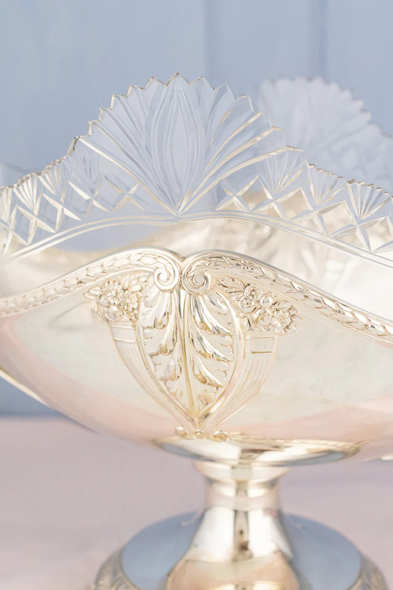 Found at a silver market in northern England, we were thrilled to discover this Antique Centerpiece Bowl with its exquisite clear glass edged liner - stunning in every way! Richly ornate with pristine cuts that form the image of an open fan at center, the top edge appears to move in the light as a cascade of saw-tooth edges flow outwards towards the dramatic loving cup style handles. Poised at just the right angle to transport with ease, the articulated handles are expertly embellished with a lovely design. This magnificent upper vessel fits seamlessly within a gleaming silver-plate pedestal base that rises from four captivating, diminutive feet.