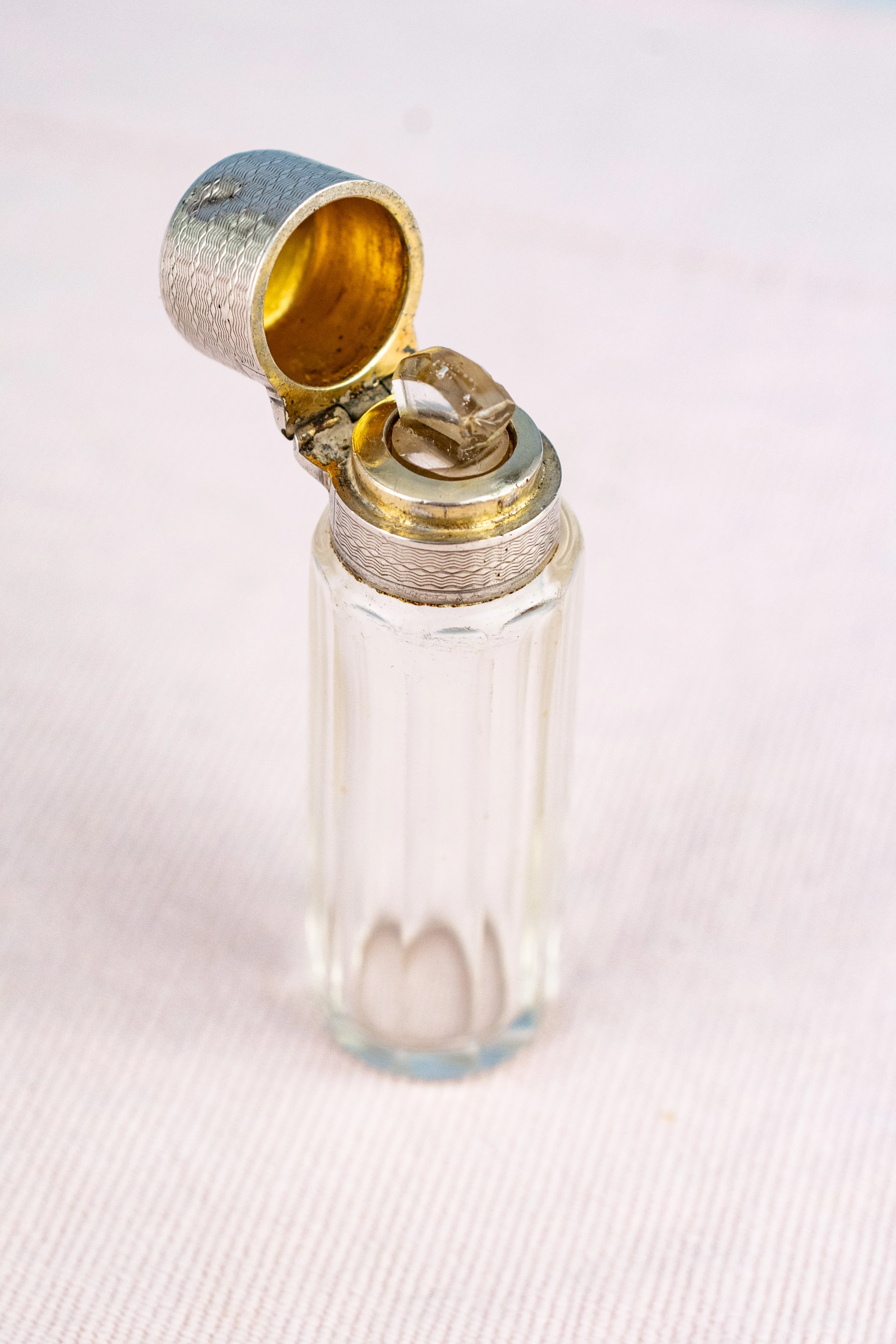 With hallmarks for French silver and an artisan mark for a maker now lost to the annals of time, this personal accessory would have been used for carrying a few drops of precious fragrance with which to scent one's outgoing correspondence to eligible gentlemen or more likely, for smelling salts. As evidenced in literature and many classic period dramas with which we are all familiar, these aromatic elixirs played a vital role in maintaining societal norms. From reviving fainting ladies to feigning one's own "spell" as an excuse to exit an uncomfortable situation, ammonia salts carried in a discreet but fashionable container were a standard woman's accessory until the mid 20th century.