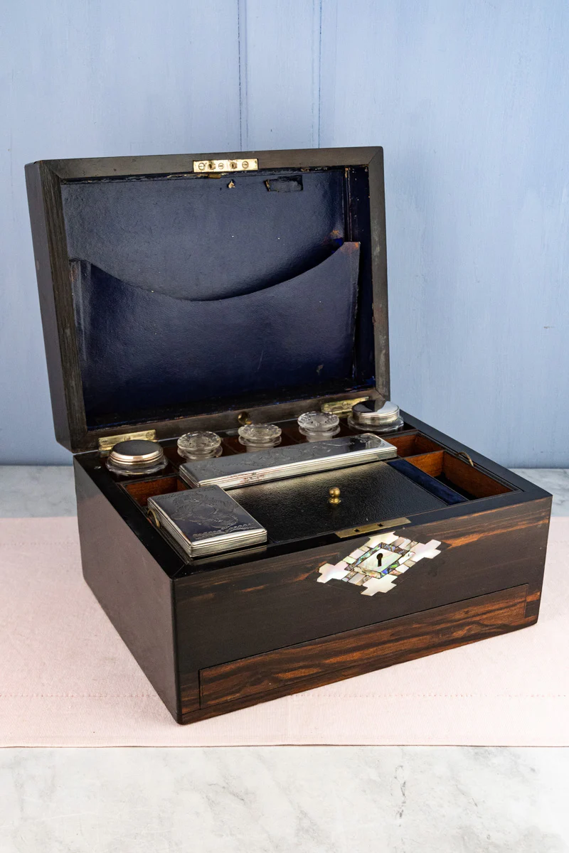 The Victorian nécessaire de voyage—a refined evolution of the French traveling box—has its roots in the late 14th century, when nobility journeyed with elegantly crafted cases filled with grooming essentials. Designed for the most discerning travelers, these exquisite boxes, often fashioned from silver, gold, mother-of-pearl, and exotic woods, held a world of conveniences within their compartments—from delicate toiletries and fine writing instruments to sewing kits and even a discreetly tucked-away minibar. A testament to both luxury and practicality, they were the ultimate companions for life on the go.