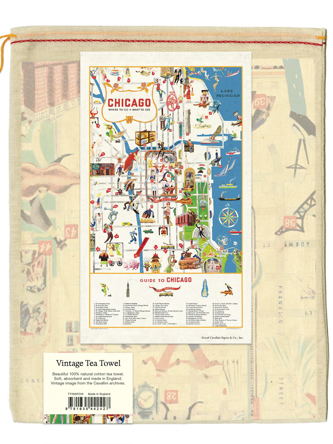 From the Magnificent Mile to Lincoln Park, from our famous the Water Tower to Wrigley Field and the Art Institute, take in the Loop, lakefront, towering architecture and all the rich culinary culture the Second City has to offer with this whimsical and wondrously colorful tea towel.