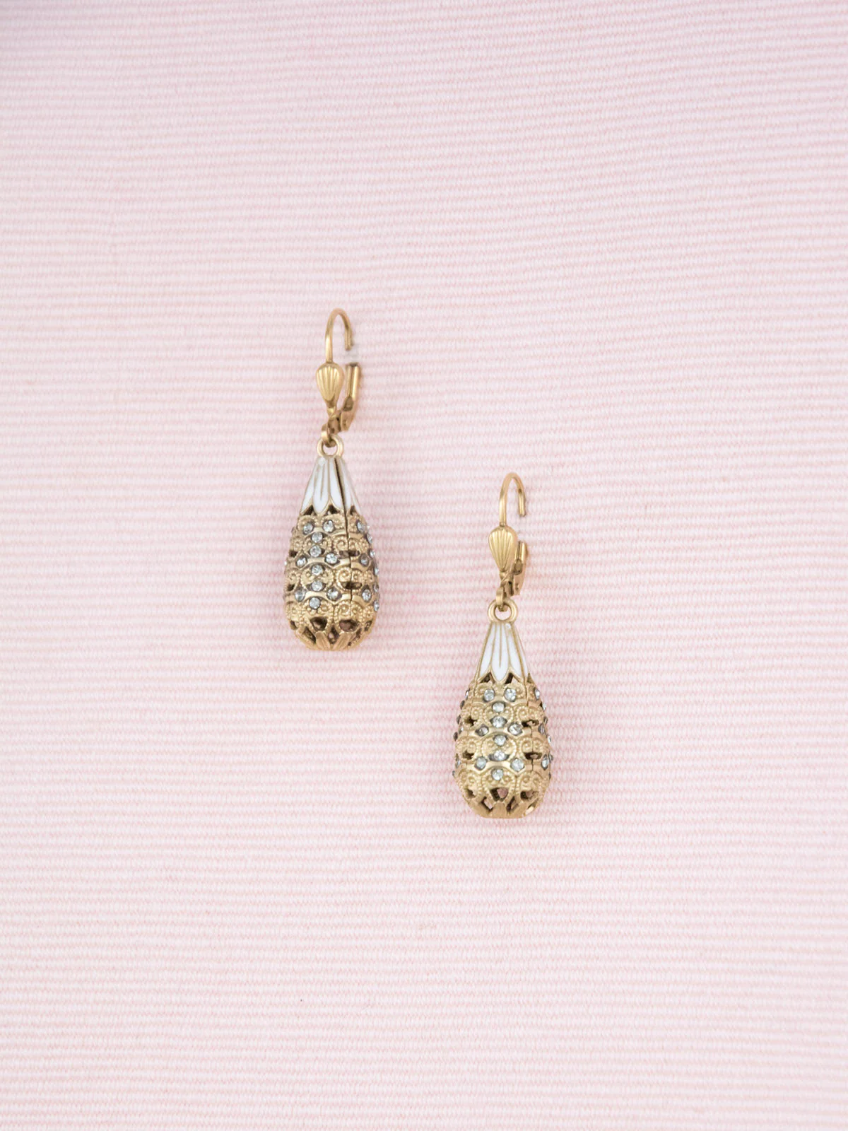 Lovingly patterned after an antique original, these carefully designed French enamel and crystal gold earrings share their deco-inspired loveliness. With their delicate charms and inspired beauty, these Swarovski crystal-encrusted gold and enamel earrings are sure to suit the romantic as they sparkle with great detail and subtle elegance.