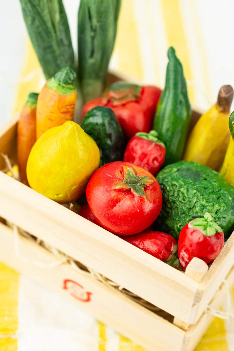 From leeks to bananas, cucumbers, avocados, tomatoes, lemons and bell peppers - everything our mouse chef (or one of his helpful sous-chefs!) will need to make the most delicious and nutritious meal! Designed in Denmark by Maileg, this charming wooden crate of hand-painted polyresin fruits and veggies is sure to inspire hours of creative playtime.Â
