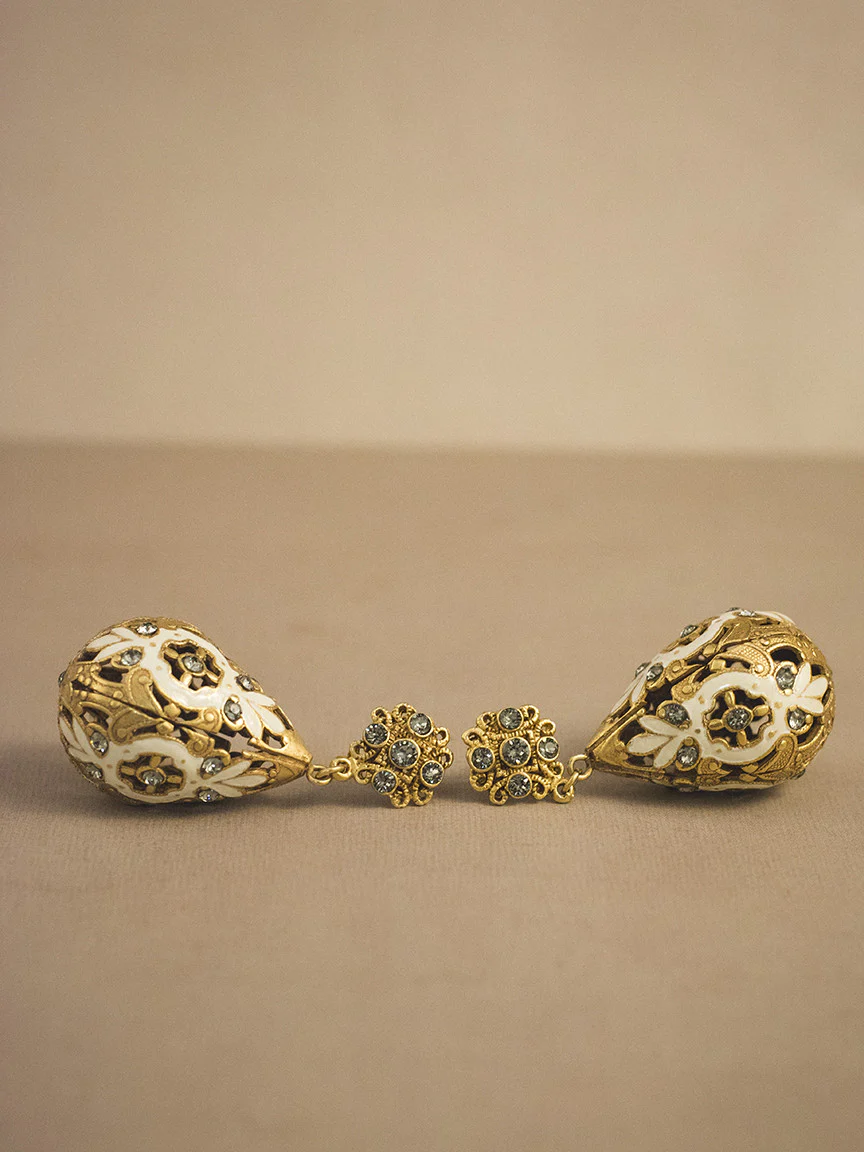 Coming to us from France with intricate detail and sparkling beauty, these gold and enamel crystal drop earrings are the most romantic we’ve seen. Dripping with intricately placed Swarovski crystals, these gold-plate over copper pierced earrings capture the light much like they capture the heart; sharing their ornate yet graceful elegance.