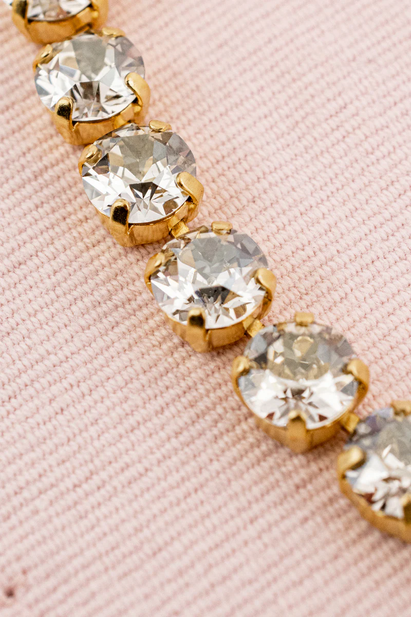 This bold necklace features a mesmerizing string of brilliantly cut clear crystals, individually set to form a gleaming gold plated ring. From its captivating glamor to its graceful silhouette, each detail exudes sophistication and luxury. As a signature accessory, selected for a special occasion, or layered to create a new favorite necklace stack, this incandescent collier is sure to leave a lasting impression.