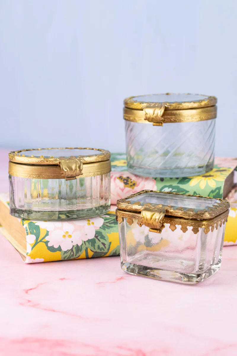Perfectly sized to hold your most beloved items of jewelry or other small trinkets, these delicately crafted boxes have faceted glass sides and beveled glass lids set within a detailed gilt brass frame. Based on antique jewelry boxes and coming in three different shapes, each petite box will lovingly contain its precious contents in lasting style.