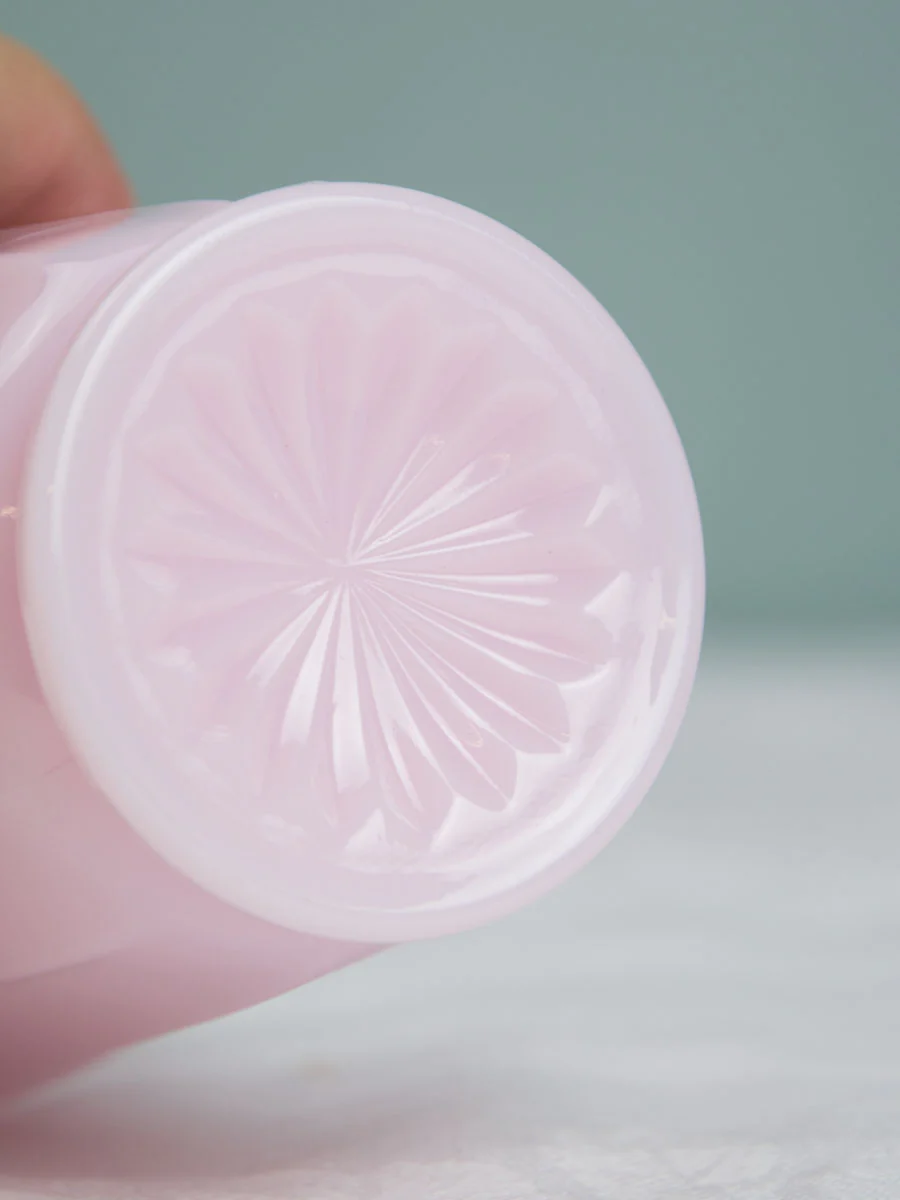 To create the dreamy shade of pink milk glass, a rare earth element called Erbium, was added to the molten glass. To perfectly capture that authentic, delicate shade of pink, Erbium is also used in the production of these tumblers. It is the addition of rare erbium that adds to the production costs and makes these beautiful pink milk glass pieces a bit more dear than their Jadeite counterparts.