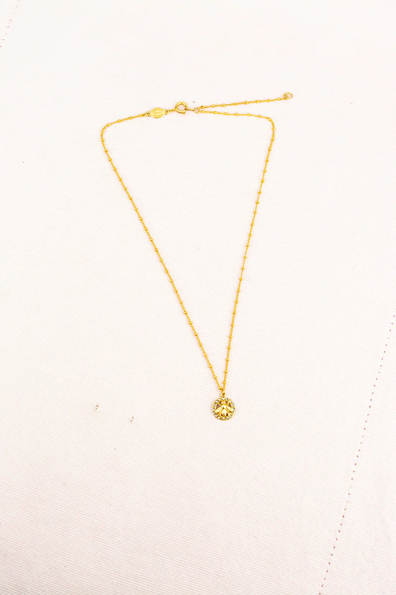 Delicate in nature, this beautifully fashioned gold charmĀ necklace is as sweet as honey.Ā Petite gold beads adornĀ the finely detailed chain, while a pretty bee charmĀ ringed in sparkling Swarovski crystals dresses the piece and adds whimsy and elegant French style.Ā