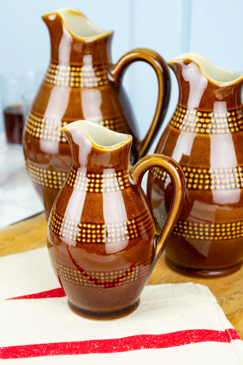 Found in the Poterie Renault warehouse, a cache of unused vintage wine pitchers that are as charming and lovely as they are practical. With an elegant silhouette and a beautifully rich russet brown glaze, the pitchers are embossed with a grid-like dot pattern inspired by the classic metal bands on wooden wine barrels.