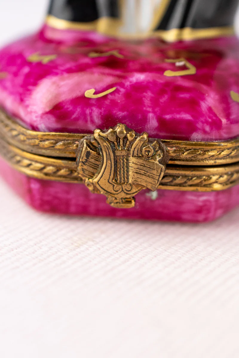 Sure to charm with melodious tones, this delightful Vintage Limoges Harp Trinket Box is captivating in every detail. With an elegant undulating silhouette, striking hand-painted details on the harp's frame and strings, colorful tufted cushion and gleaming gold crown seem to bring the instrument to life. Lifting the charming harp from its perch atop the cerise-hued cushion reveals playful musical notes upon a staff hidden inside. Marked 'Peint a Main' (painted by hand) and 'Limoges, France' on the underside, the lyrical box is trimmed in antique brass with a clasp in the form of a classic lyre harp. Made entirely in France, this very grand box is certain to bring the eternal joys of music to your collection.